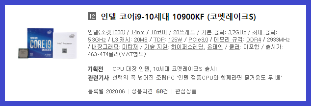 i9-10900KF 같이 접미사 KF가 뜻하는 것은 오버클럭이 가능하나 내장그래픽 기능은 제외한 모델입니다.