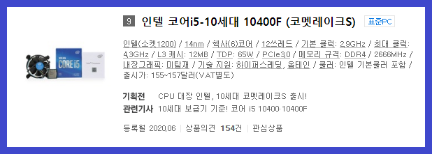 i5-10400F 처럼 인텔 CPU 숫자뒤에 F라고 써져있는 것은 기본형에서 내장그래픽을 제거한 것입니다.